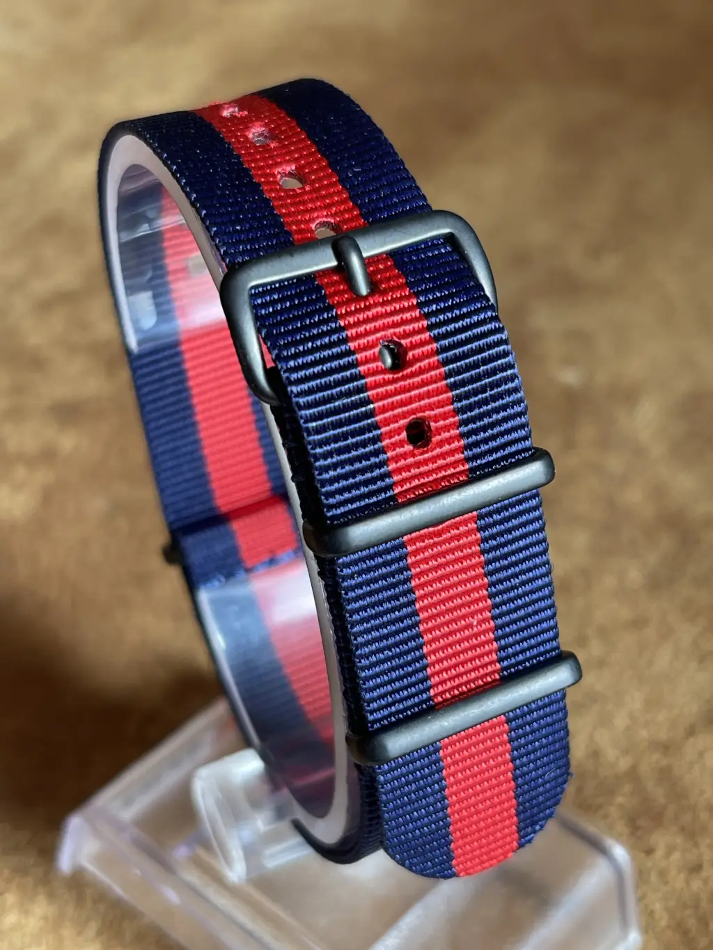 Pulseira Nato em nylon marinho com lista vermelha anéis PVD Preto